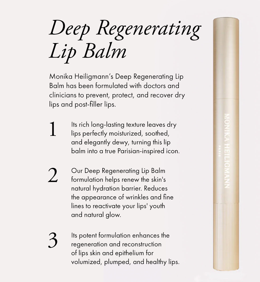 Datorită formulei sale avangardiste, balsamul nostru iconic Deep Regenerating Lip Balm este o capodoperă a îngrijirii moderne a buzelor, dezvăluind și perfecționând frumusețea interioară a buzelor. Dacă căutați să regenerați buzele uscate, să le protejați de leziuni sau să vă accelerați recuperarea post-injecție, tocmai v-ați găsit îngerul păzitor!